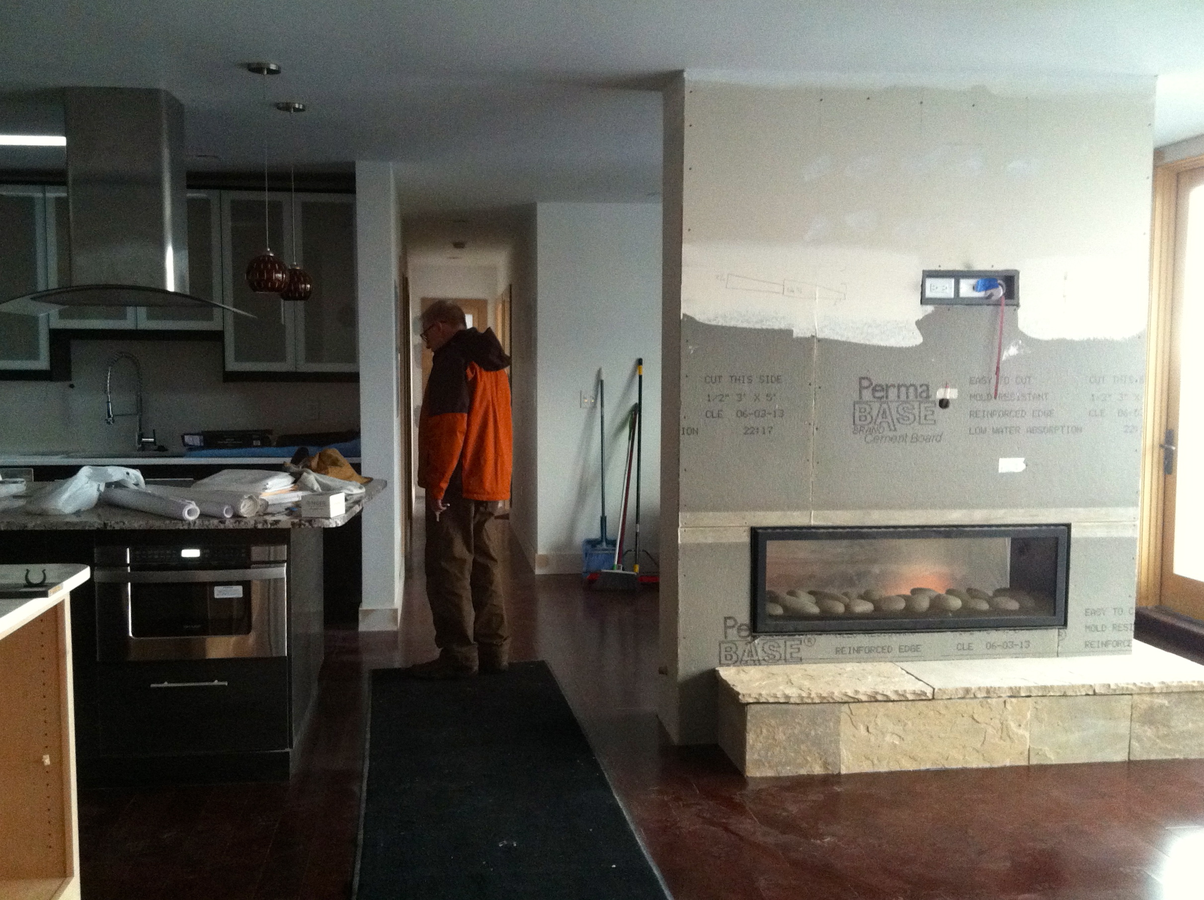 Tonight I came home to see that the tile for the fireplace has been installed. It had to wait until the black steel surround was installed, which happened a few weeks ago. The TV will be mounted above the fireplace. Can’t wait to have a fire in the fireplace, especially now that the weather is getting cold.
